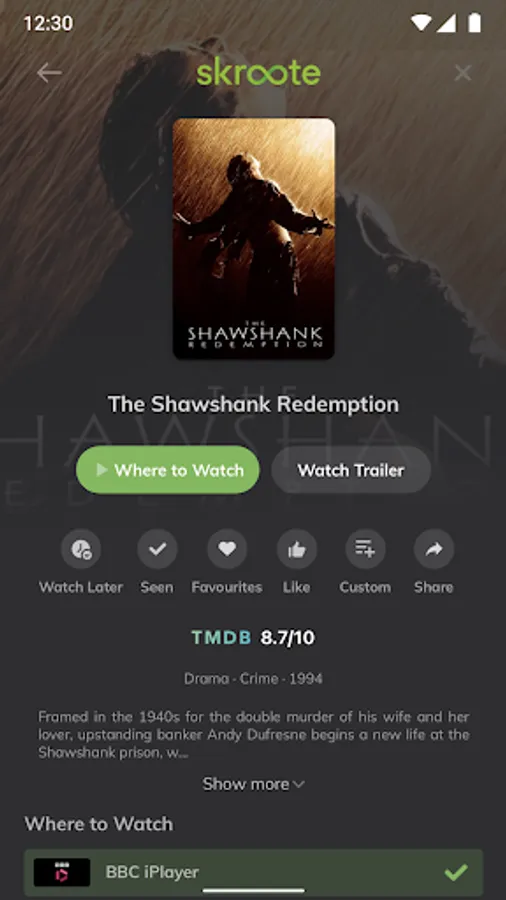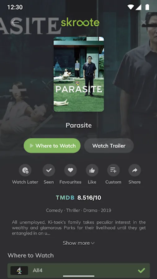 Skroote instantly searches all of the major streaming platforms including Netflix, Amazon Prime Video, Disney+, Apple TV+, BBC iPlayer, All4, ITV and many more.
