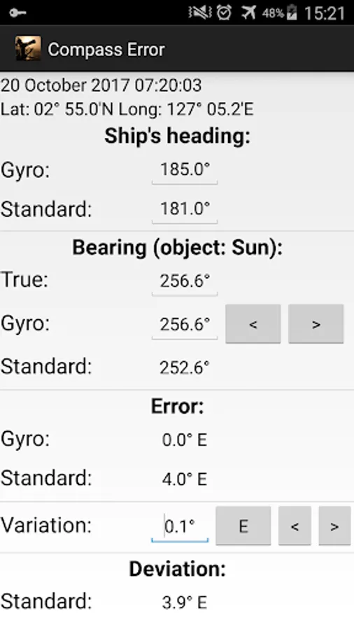 In addition, for magnetic compass error calculation, finds Variation (Mag. Declination) for given positon. Calculation of variation is based on the latest World Magnetic Model.