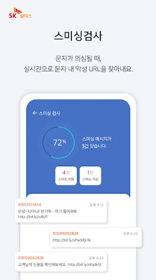 4. Smishing Inspection: It is too difficult for users to take care of impersonating courier companies, impersonating financial institutions, and numerous smishing techniques on their own. Mobile Guard finds malicious URLs in messages in real time and notifies you.