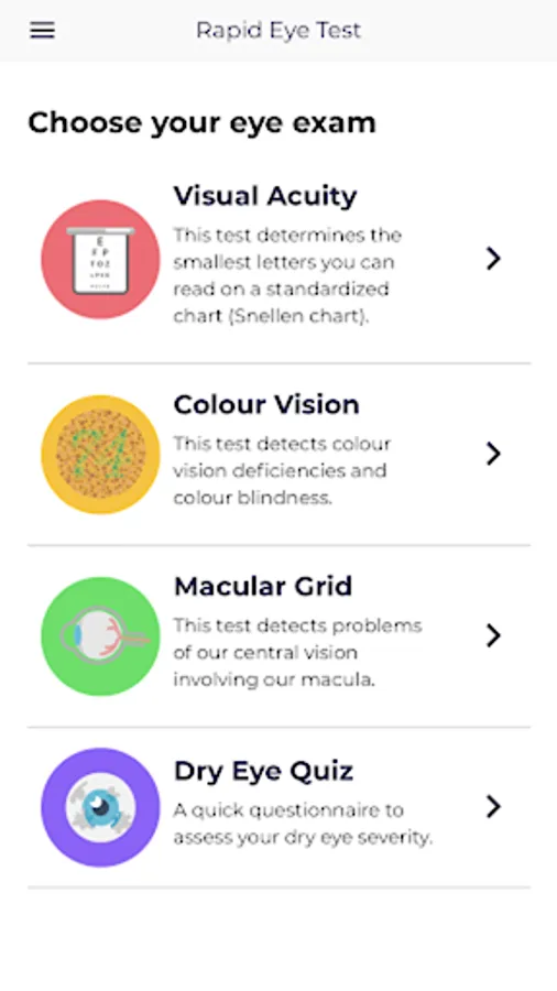 This one-stop application was built for users to perform simple self-assessment eye tests including visual acuity check, colour vision check, macular amsler grid and dry eye questionnaire. This allows users to keep track of their own eye health easily. This simple tool can be used anywhere at any time, without the need for any login information. Created by an ophthalmologist, it is a reliable tool to assess basic visual functions.