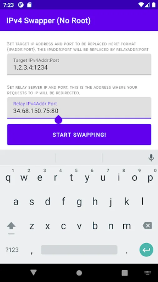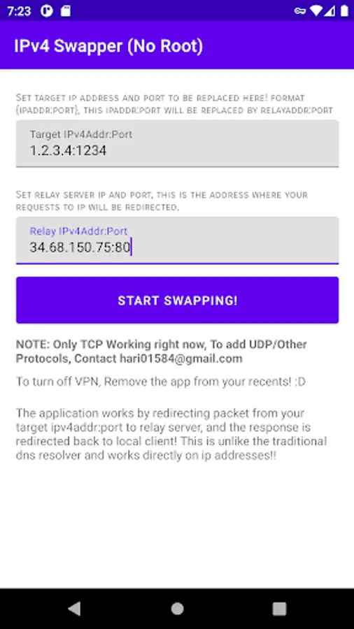 IPv4 Swapper - No Root is achilles heel of all network related connections, It allows you to swap IPv4 addresses and their ports, Essentially mapping a real ip address and port behind a fake ip address and port, So all the network packets sent to this masked ip will be redirected to your target server and vice versa!! Therefore essentially your android app (client) will think its connecting to the right server whereas you can redirect it to a tcp proxy and modify the packets as you wish!!