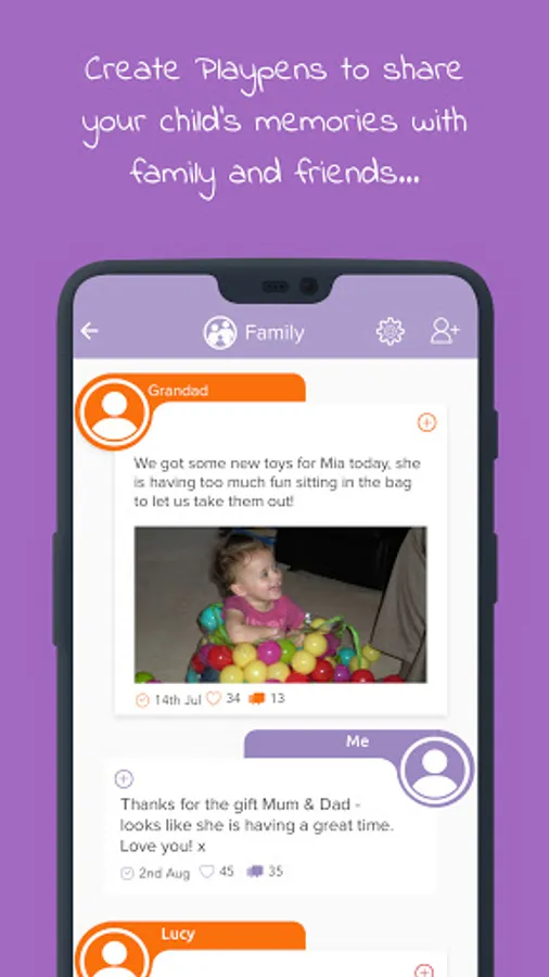 Creating a Playpen gives you complete control over who sees your content whilst creating a totally interactive experience for your 'Buddies' to enjoy. Add your friends and family to different Playpens and allow them to share in the joy of seeing your child grow.