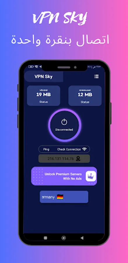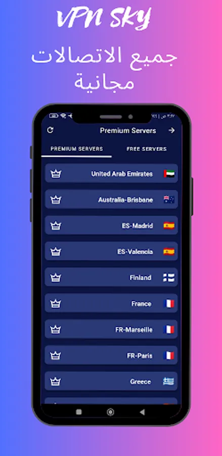 Thanks to its intuitive and easy-to-use user interface, you can easily and quickly connect to any available server through the VPN SKY app. You will enjoy a wide range of servers spread across many countries, allowing you to bypass geo-restrictions and access blocked and protected content anytime and anywhere.