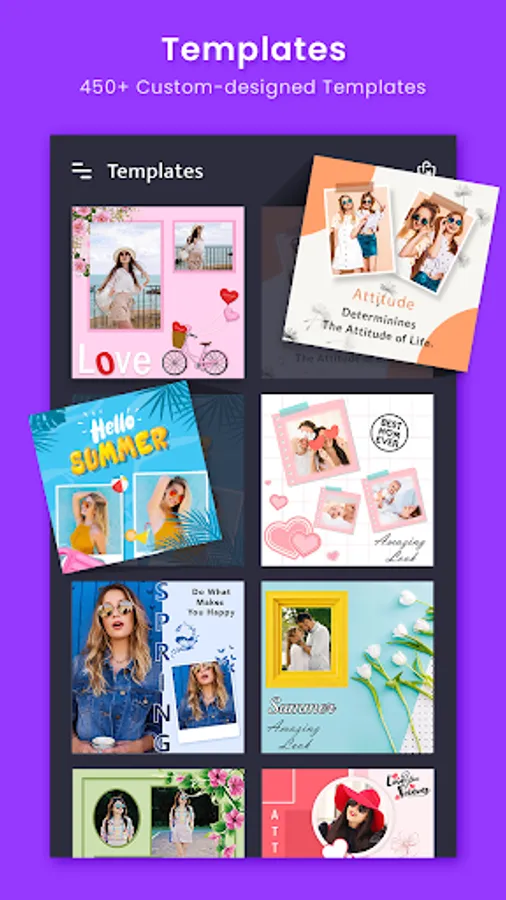 ● 100+ popular design templates, such as Story, Frame, Life, Love, IG, Film, Magazine, Ripped Paper…