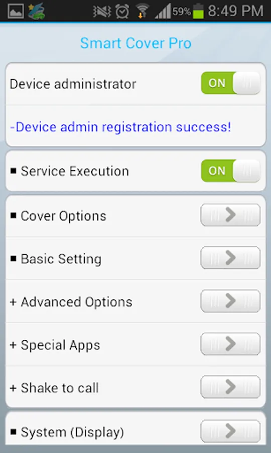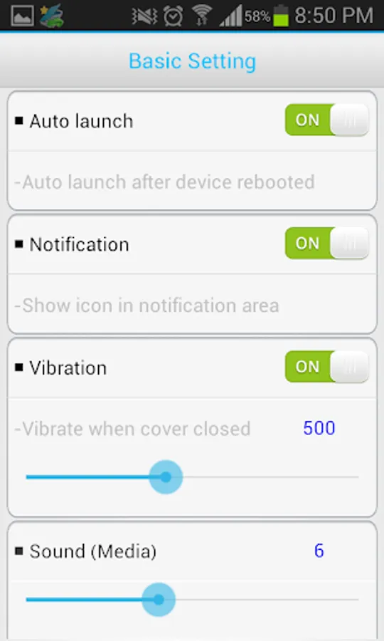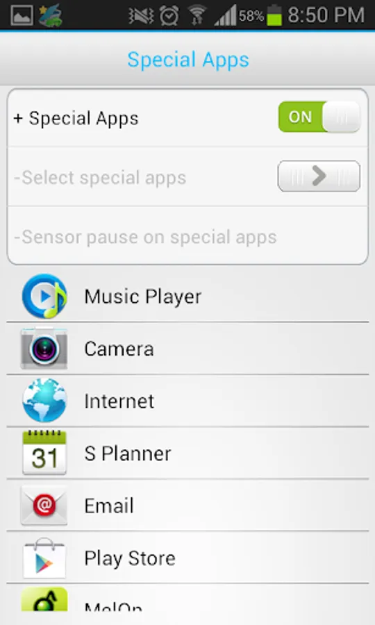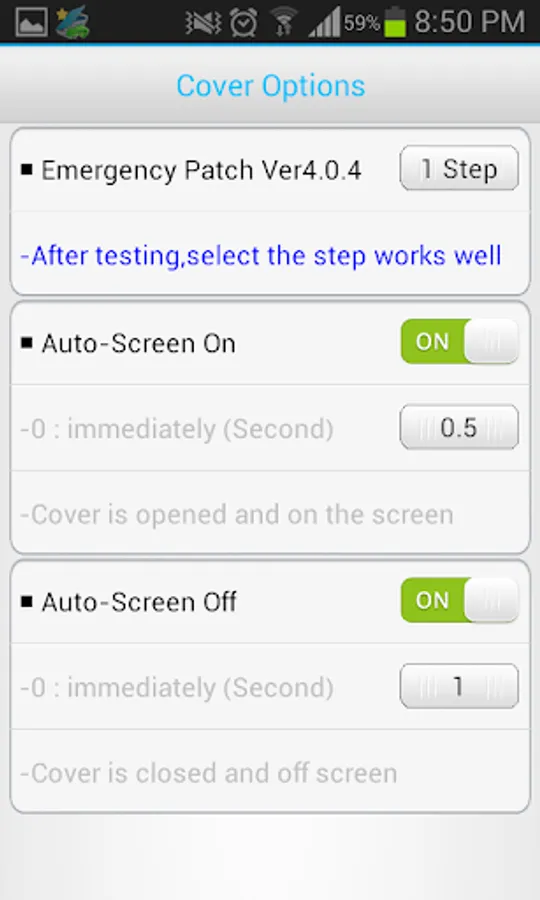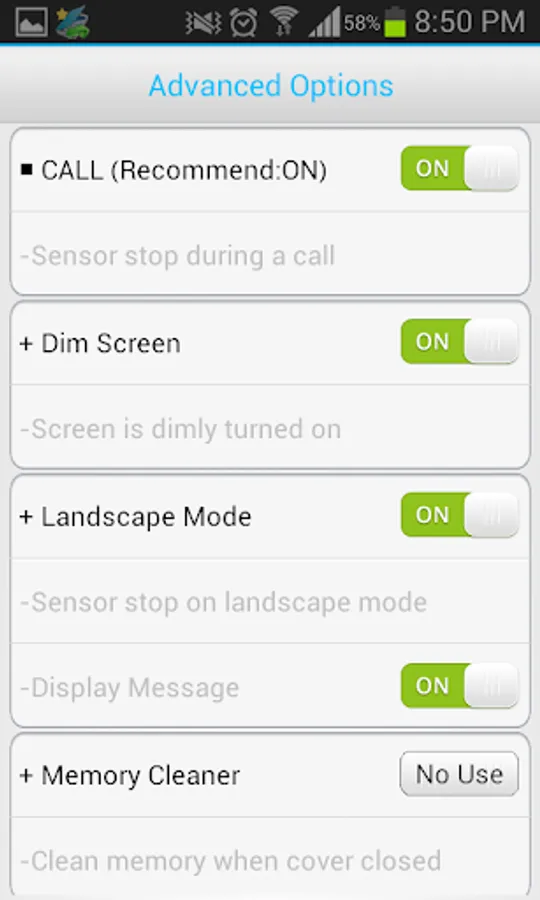 - Screen off, Sensor On/off , Memory optimizer and Rotation control