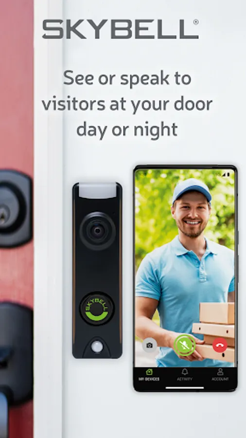 Get instant alerts on smartphones, tablets, and smartwatches when someone is at your door or motion is detected in HD video with two-way talk on any of SkyBell’s Video Doorbells or Cameras. SkyBell sends a live video feed to your devices so you can hear and speak to the person at your door or in the house, whether at home, at work, or on the go - day or night.