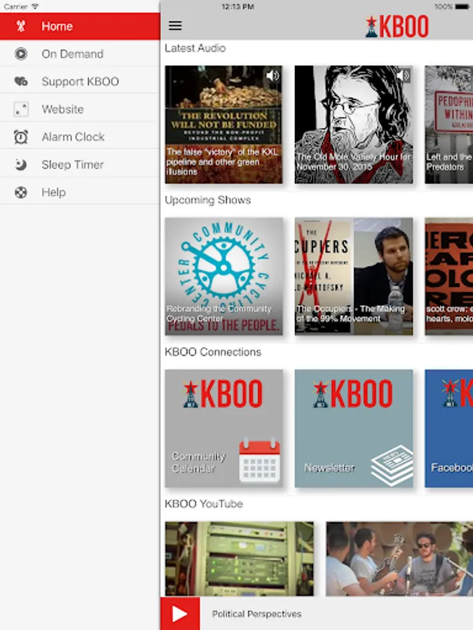 The KBOO Community Radio App allows you to listen to KBOO, pause and rewind the live audio, view the program schedule, and wake up to KBOO with the alarm clock!
