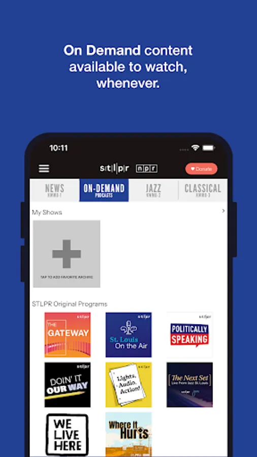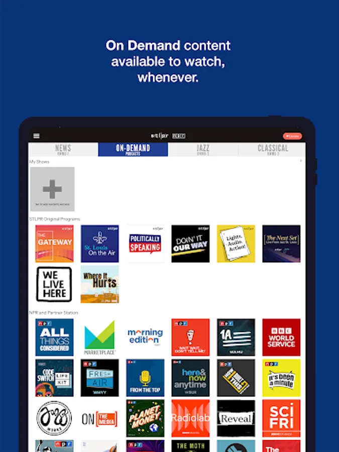 The St. Louis Public Radio App allows you to listen to St. Louis Public Radio live, pause and rewind the live audio, and view the program schedule for all the St. Louis Public Radio streams at once! You can explore On Demand content, search for stories, bookmark a story for later, and wake up to St. Louis Public Radio with the alarm clock!