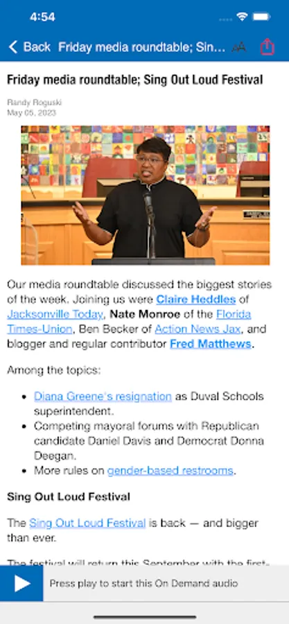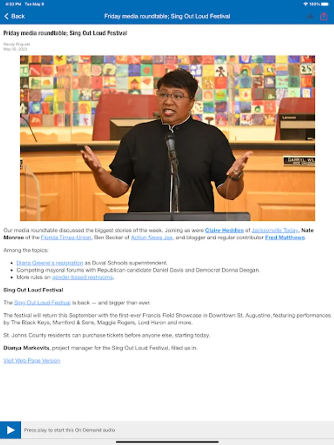 • The WJCT Public Media App displays the web page associated with the program or program segment you are listening to On Demand so you can explore for more information.