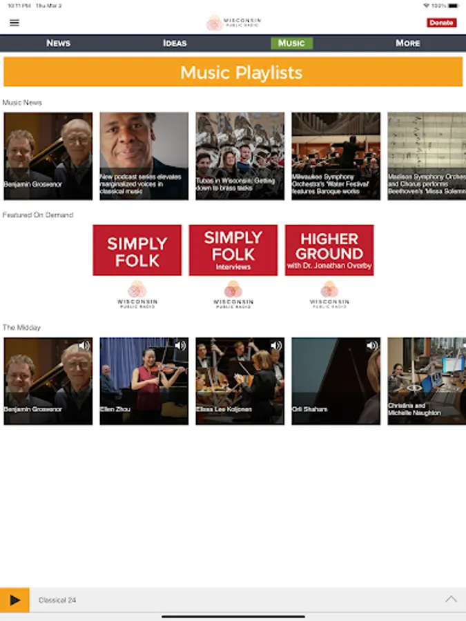 The Wisconsin Public Radio App allows you to listen to WPR’s Ideas Network, News and Classical Network, and 24 Classical Network live, pause and rewind the live audio, and view the program schedule for all the WPR streams at once! You can explore On Demand content, search for programs, bookmark a program for later, and wake up to WPR with the alarm clock!