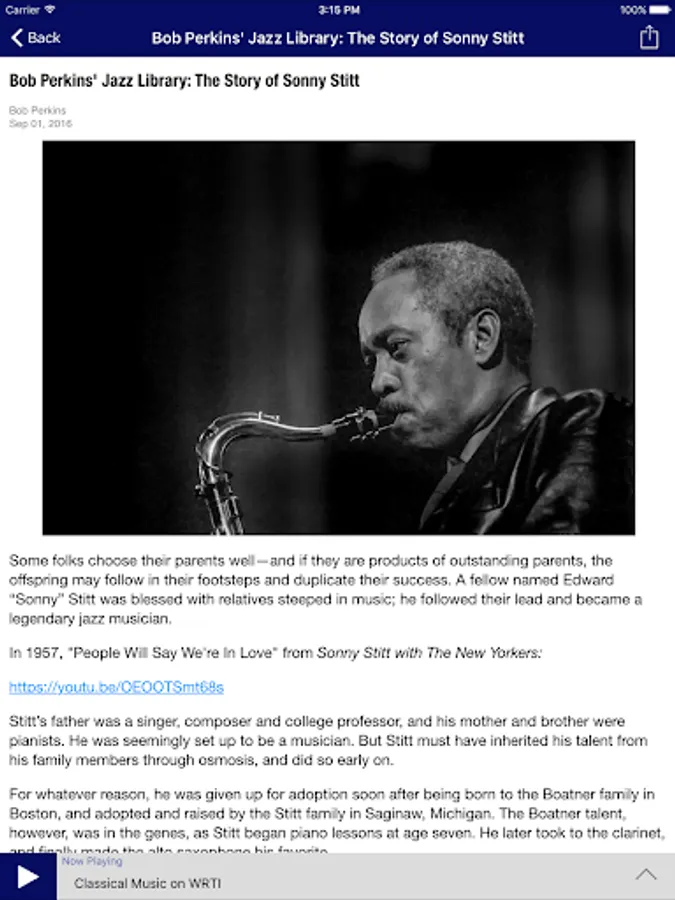 Listen to live streams from WRTI even while traveling! Start the App and your favorite station starts playing.