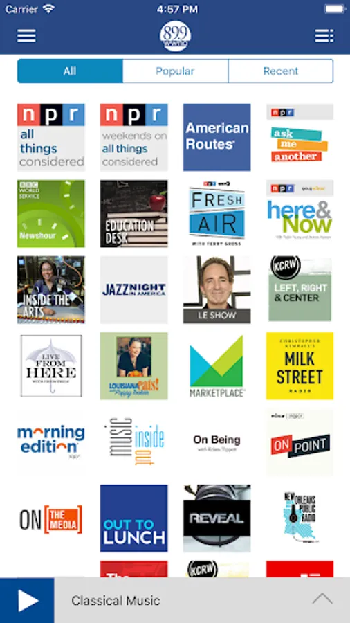 • The unique “Search Public Radio” feature finds stories or programs across hundreds of stations and web pages and makes it easy to play instantly.