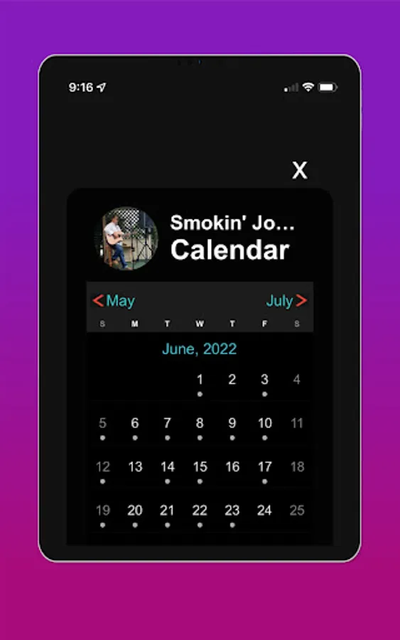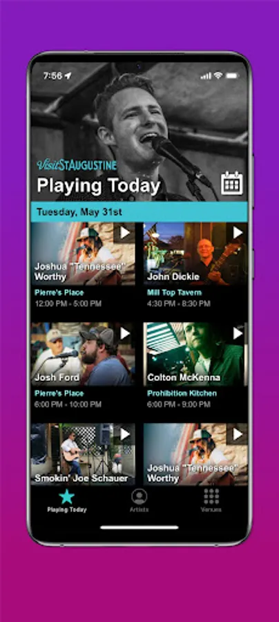 Look up performances by date, musician, genre, and venue. Tap on a venue to see their live music calendar, then tap again to hear a song from the next musician. The LIVE MUSIC Calendar shows every known local live music event, showing the venue, the performer, and the time their gig starts and finishes.