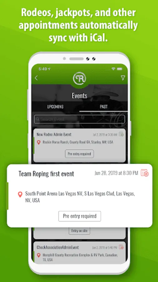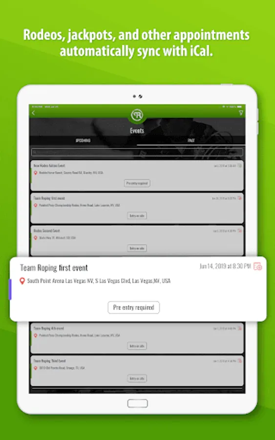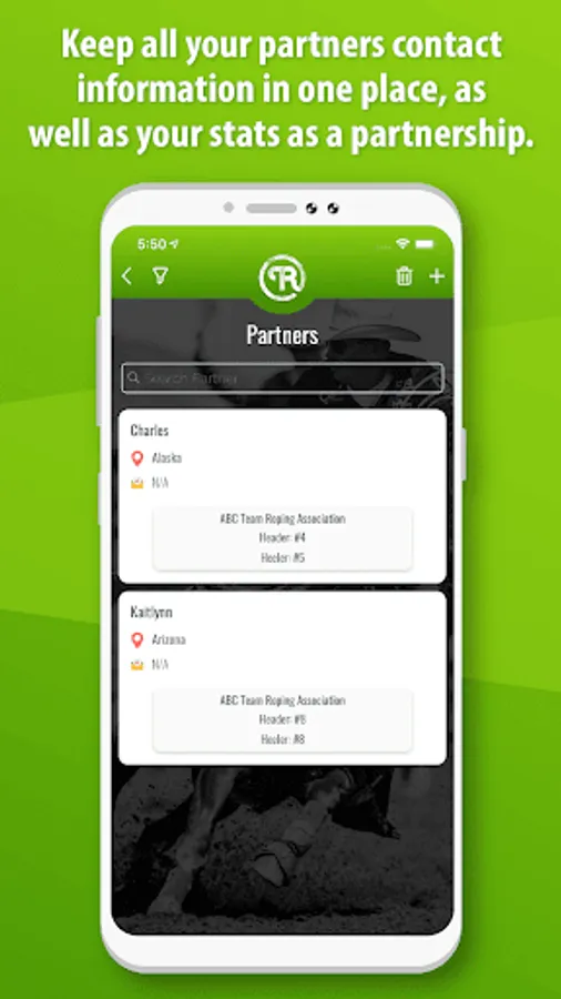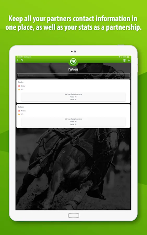 Keep all your partners in one place, along with their contact info and numbers by association. Search through your partners by number, association, or location and text, call, or email right from Team Roping Buddy to fill up your slots.