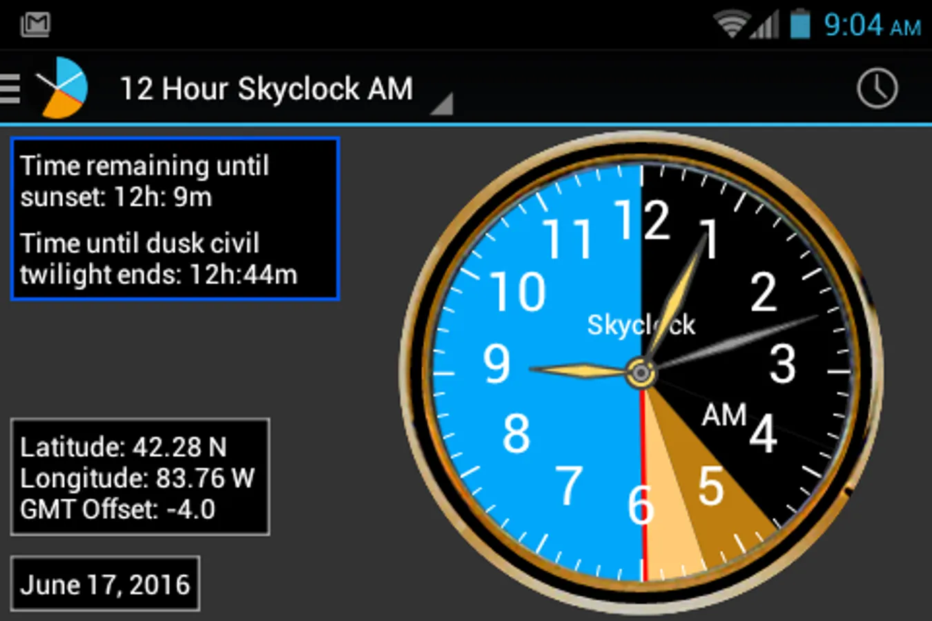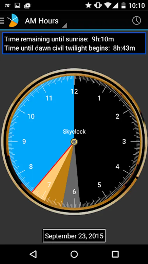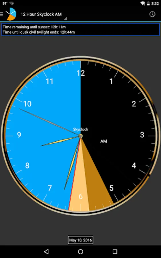 Skyclock® shows you ‘usable twilight’ so you can extend, or plan, your day. Twilight is the time between day and night when there is available light before sunrise, or after sunset. All of these times change every day, and depend on where you are.