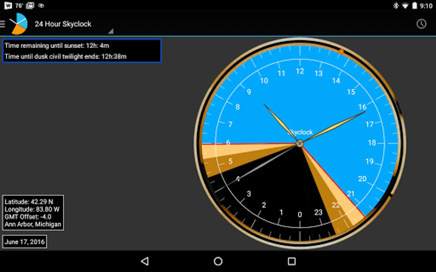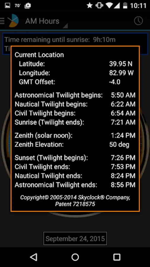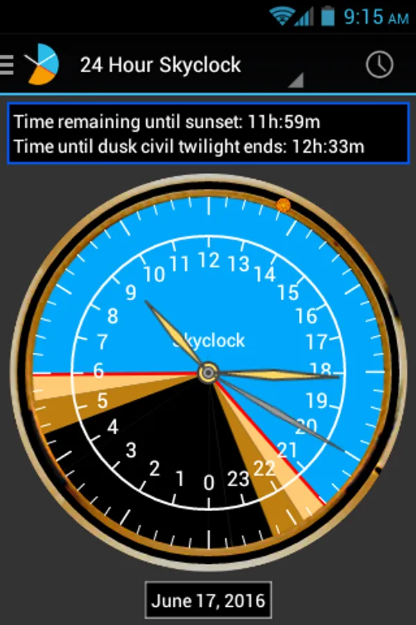 Skyclock® is the ultimate Sun calculator for sunrise, sunset, and twilight times. Calculates for exactly where you are with patented Pie-Slice Display.