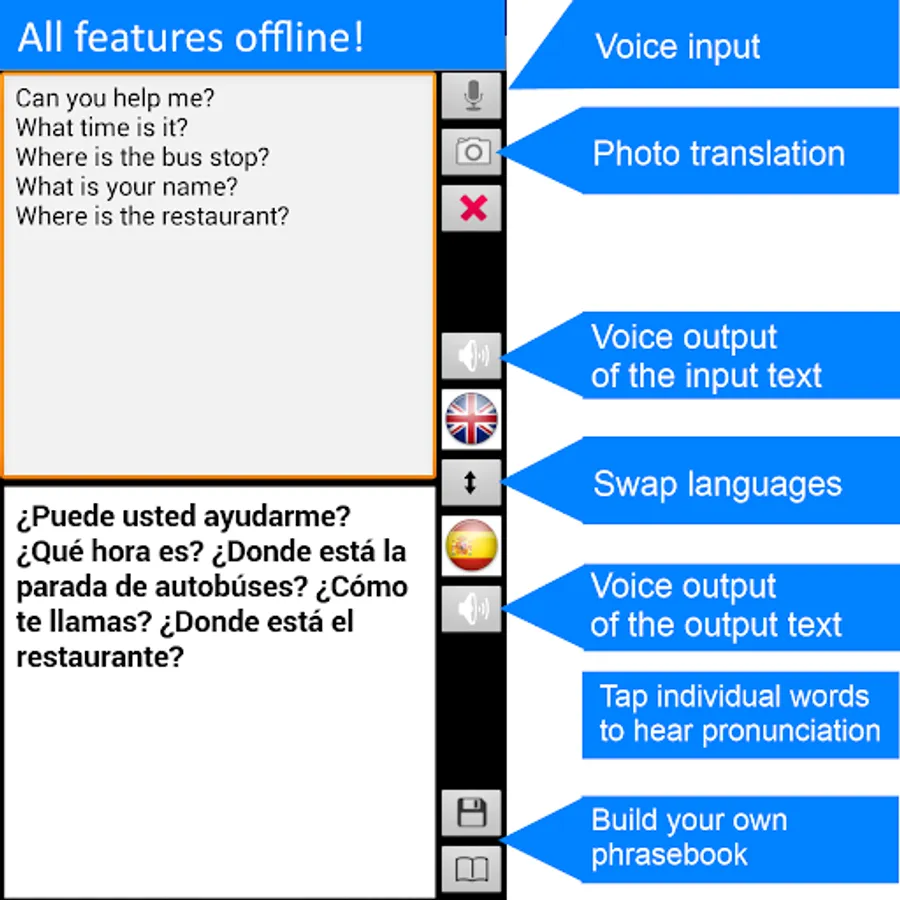 Free offline* speech translator, dictionary and phrasebook app --translate offline voice, camera photos and text between English and Spanish without internet and when you are abroad! Save on data roaming charges when you travel!
