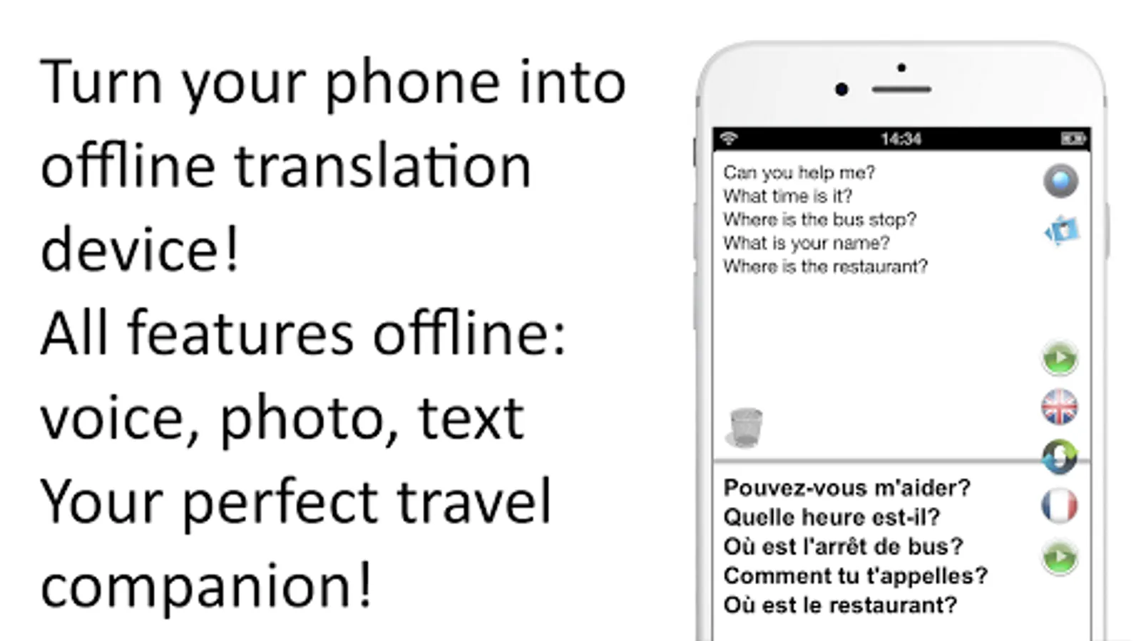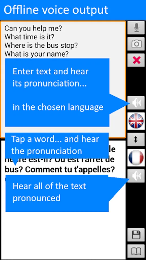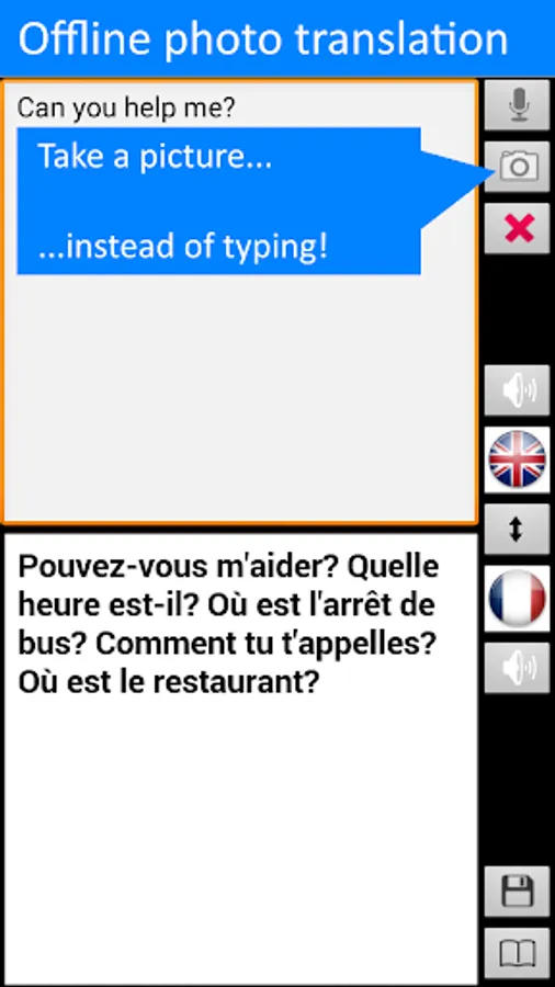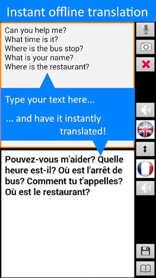 Free offline* speech translator, dictionary and phrasebook -- the ultimate foreign language text translation tool for English and French when you are abroad! Save on data roaming charges when you travel!