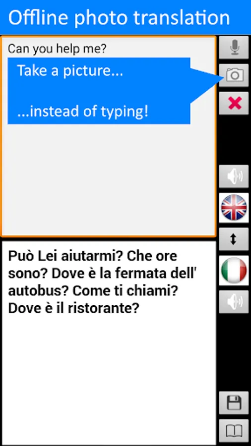 Free offline* speech translator, dictionary and phrasebook --translate offline voice, photos and text between English and Italian without internet and when you are abroad! Save on data roaming charges when you travel!