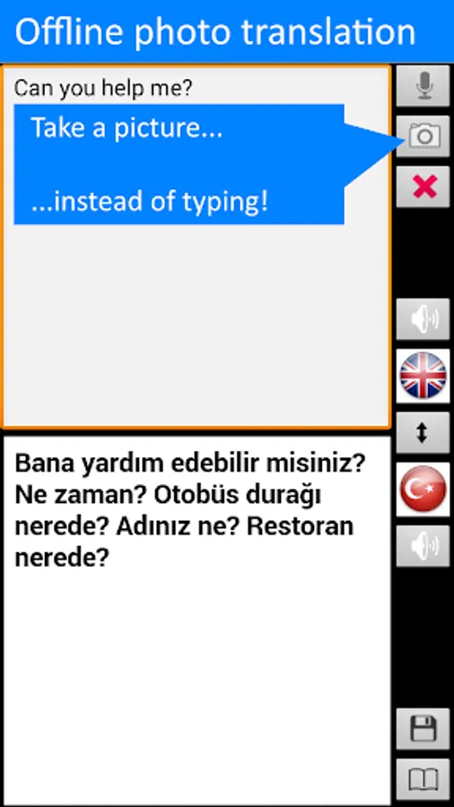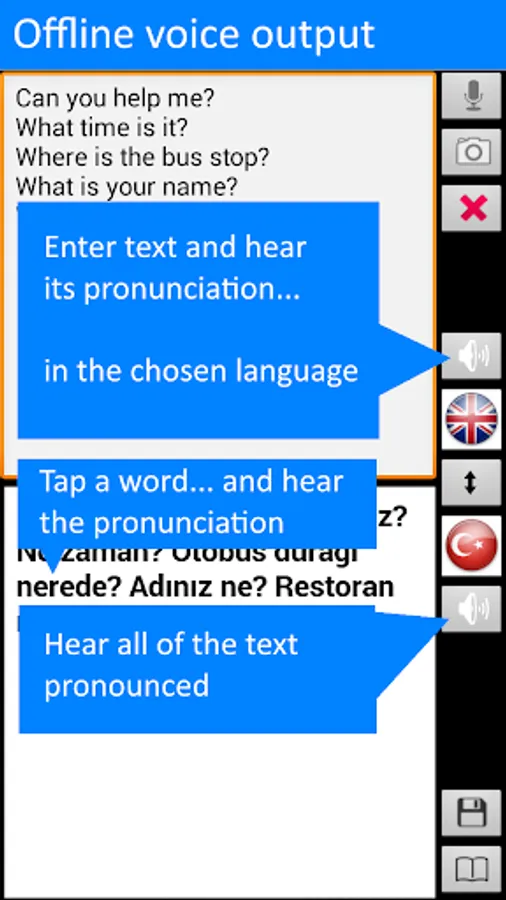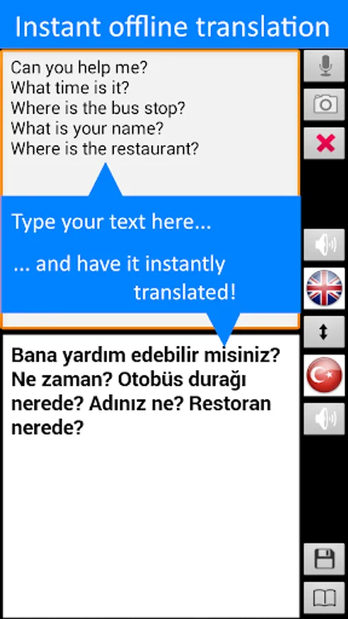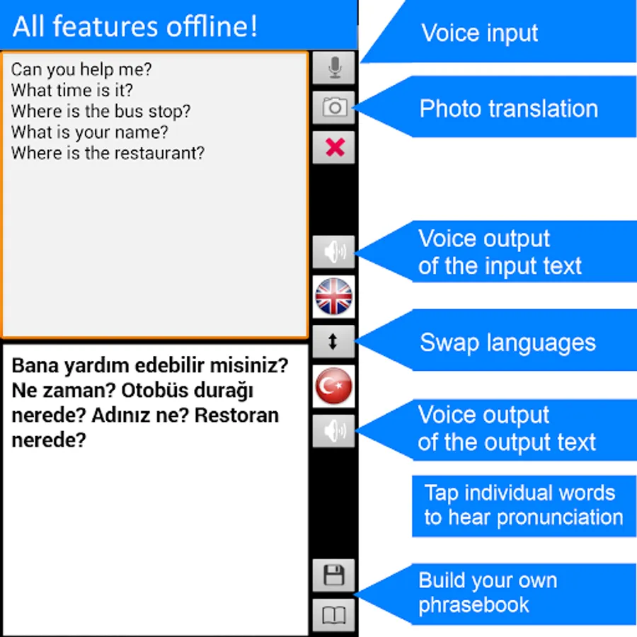 OFFLINE translator and dictionary -- the ultimate foreign language tool when you are abroad! Translates text between English and Turkish. Save on data roaming charges when you travel!