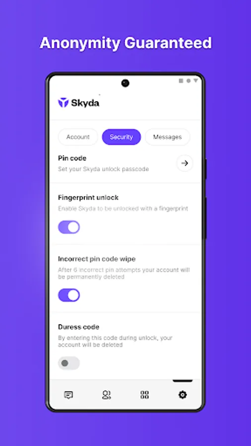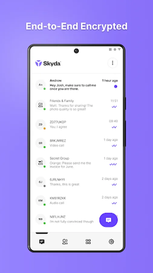 TOTAL ANONYMITY: Skyda's design philosophy ensures zero data on servers. Besides email, we do not store anything else. Contacts, chats, and files are listed on your device only, avoiding any server storage. Everything is encrypted on your device, guarding you against personal data misuse, including metadata. Skyda aligns flawlessly with the European privacy legislation (GDPR).
