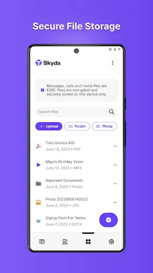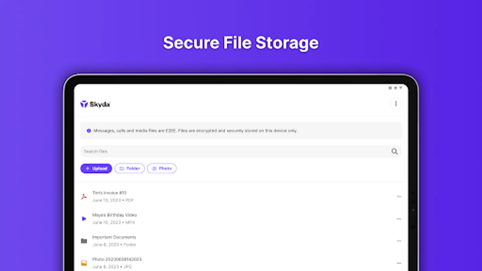 SECURE FILE STORAGE: Skyda offers secure file storage solutions in the app. Beyond simply storing your files, we encrypt each directly on your device, providing an additional defense against unauthorized access.