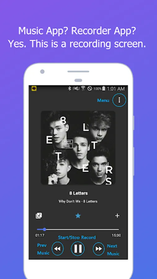 - Music theme - Play button (start recording), Pause button (end recording).