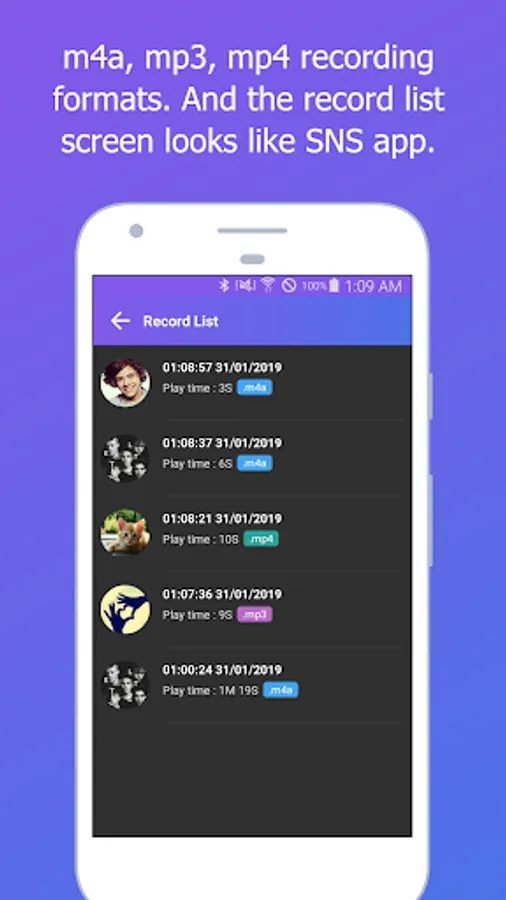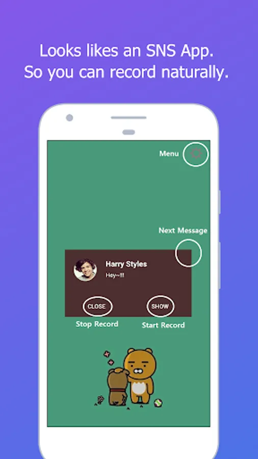 - Various customized recording screens are provided, including SNS themes, music themes, and chatbot themes.