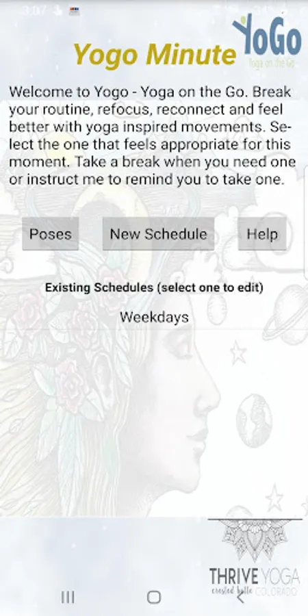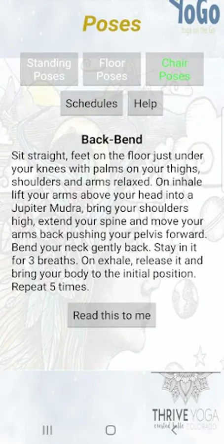 Yogo - Yoga on the Go contains detailed descriptions of convenient yoga poses to do throughout your normal day, to supplement your yoga practice on the mat. You can create weekly schedules to remind you at chosen times of the day to take a minute to pause and perform a pose. This keeps you in touch with your body and refreshes you even in the middle of your daily work tasks, making you more productive and comfortable. It also helps you refine your technique. Convenient poses include chair, floor, and standing.