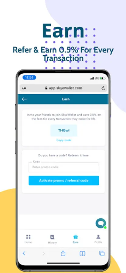 For every user you refer Skye Wallet to, you are rewarded with 0.5% of their transaction as referral bonus. This is passive income for you.