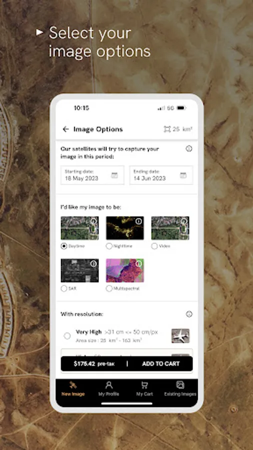 The process is simple and user-friendly. Either choose an Existing Image from our archive or order a New Image and have a satellite capture of your area of interest during a future date range of your choosing. Through the app, you can also select the sensor type that will best meet your needs, including daytime, nighttime, video, and radar.