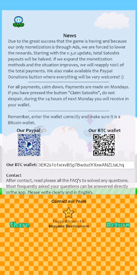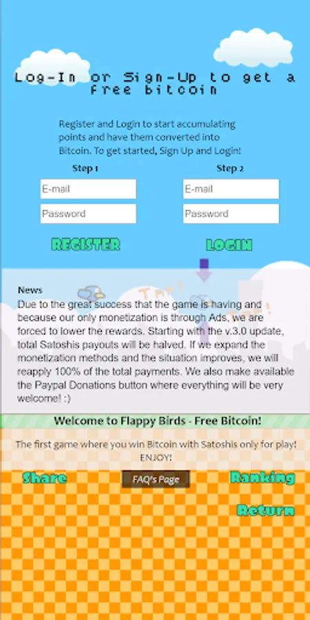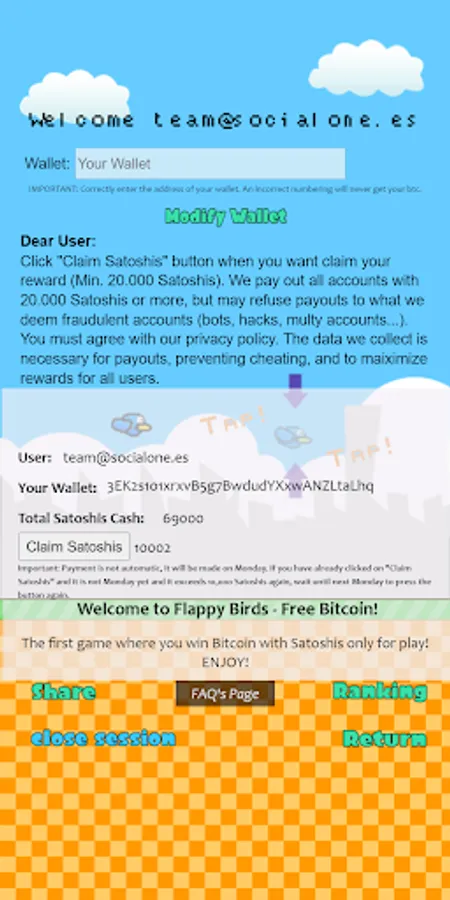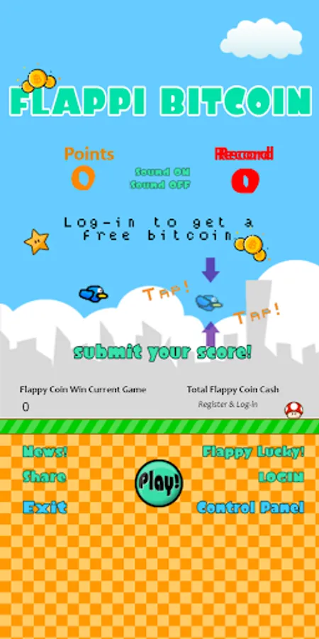 The mythical game with more fun than ever! The first game with which you win bitcoin! Flap the bird's wings, score points and those will automatically become Btc!