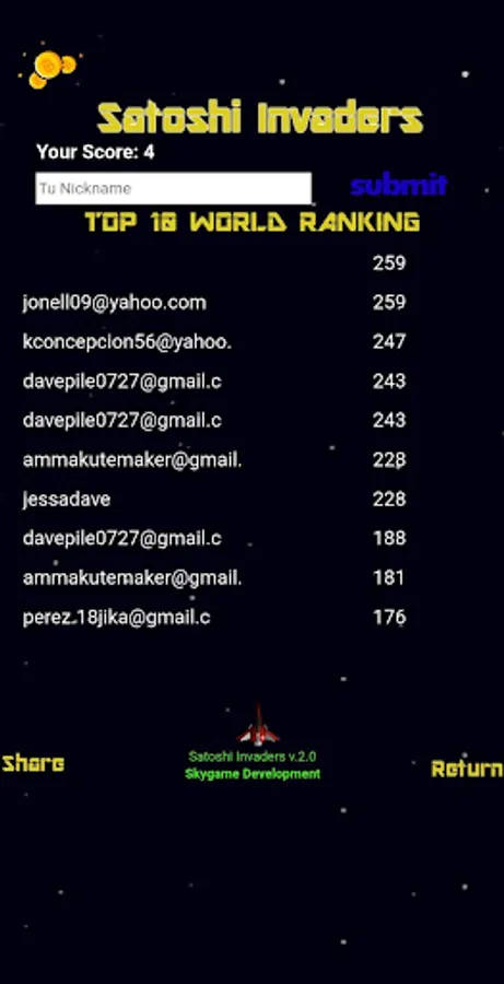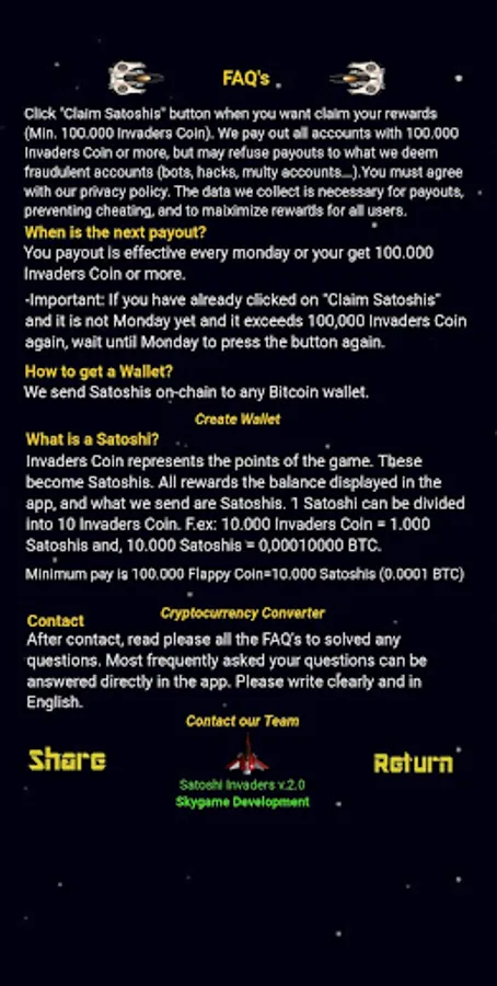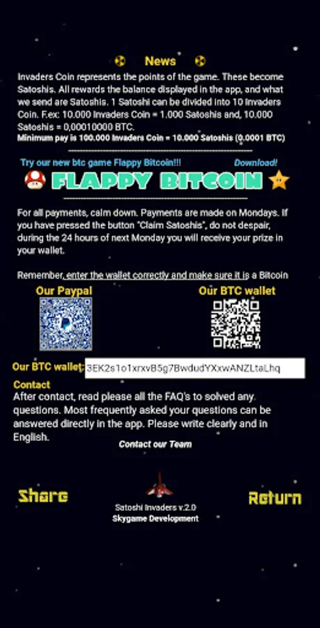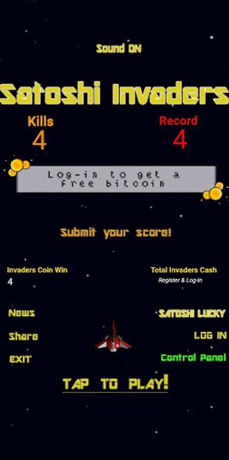 The great mythical game Space Invaders Remake with more fun than ever! The first game you win bitcoins with! Eliminate enemies, earn points and those will automatically be converted to Bitcoin!