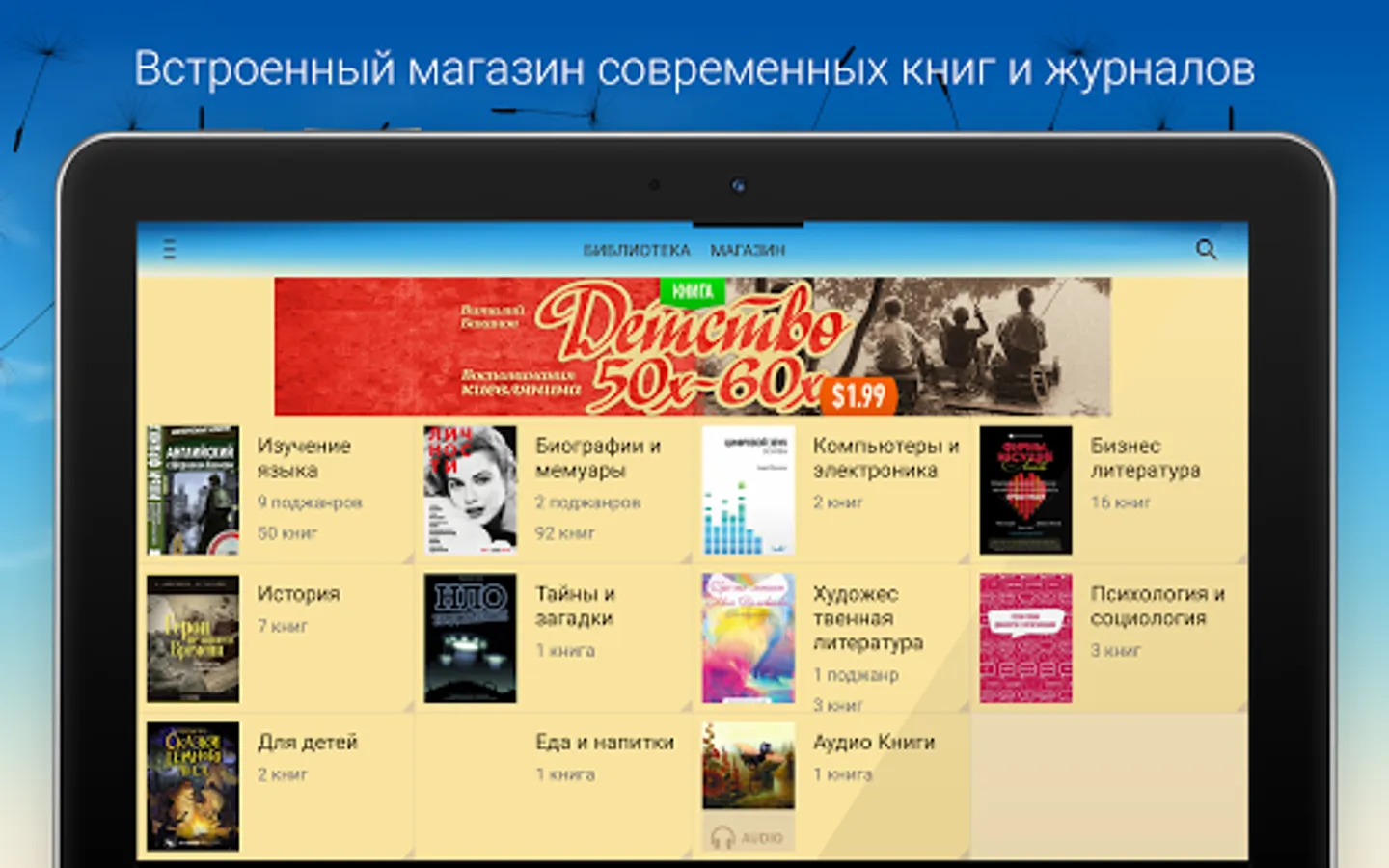 • Built-in store of modern books, magazines and audiobooks