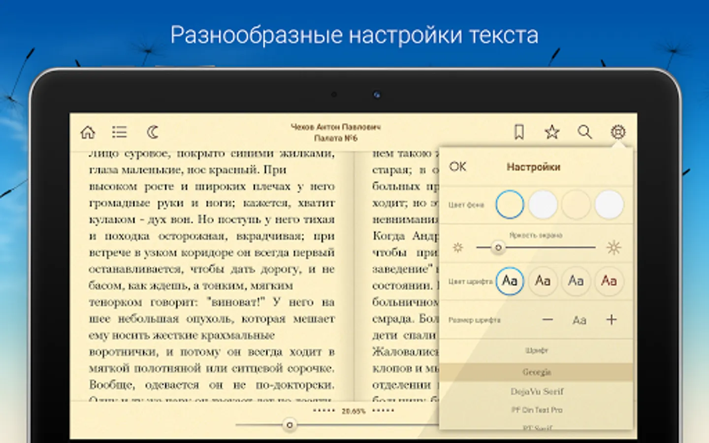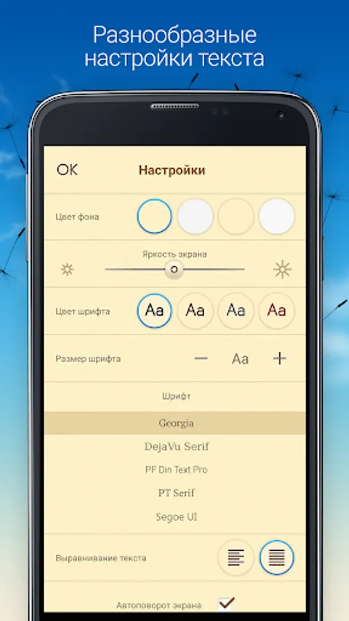 • Flexible settings for displaying text (selecting a font, changing the color and texture of the "paper" background)