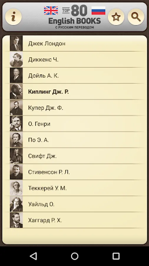 The authors included in the library: Charles Dickens, Jack London, O. Henry, Oscar Wilde, Arthur Conan Doyle, Rudyard Kipling, Fenimore Cooper, Edgar Allan Poe, Robert Louis Stevenson, Jonathan Swift, William Thackeray, Henry Haggard.