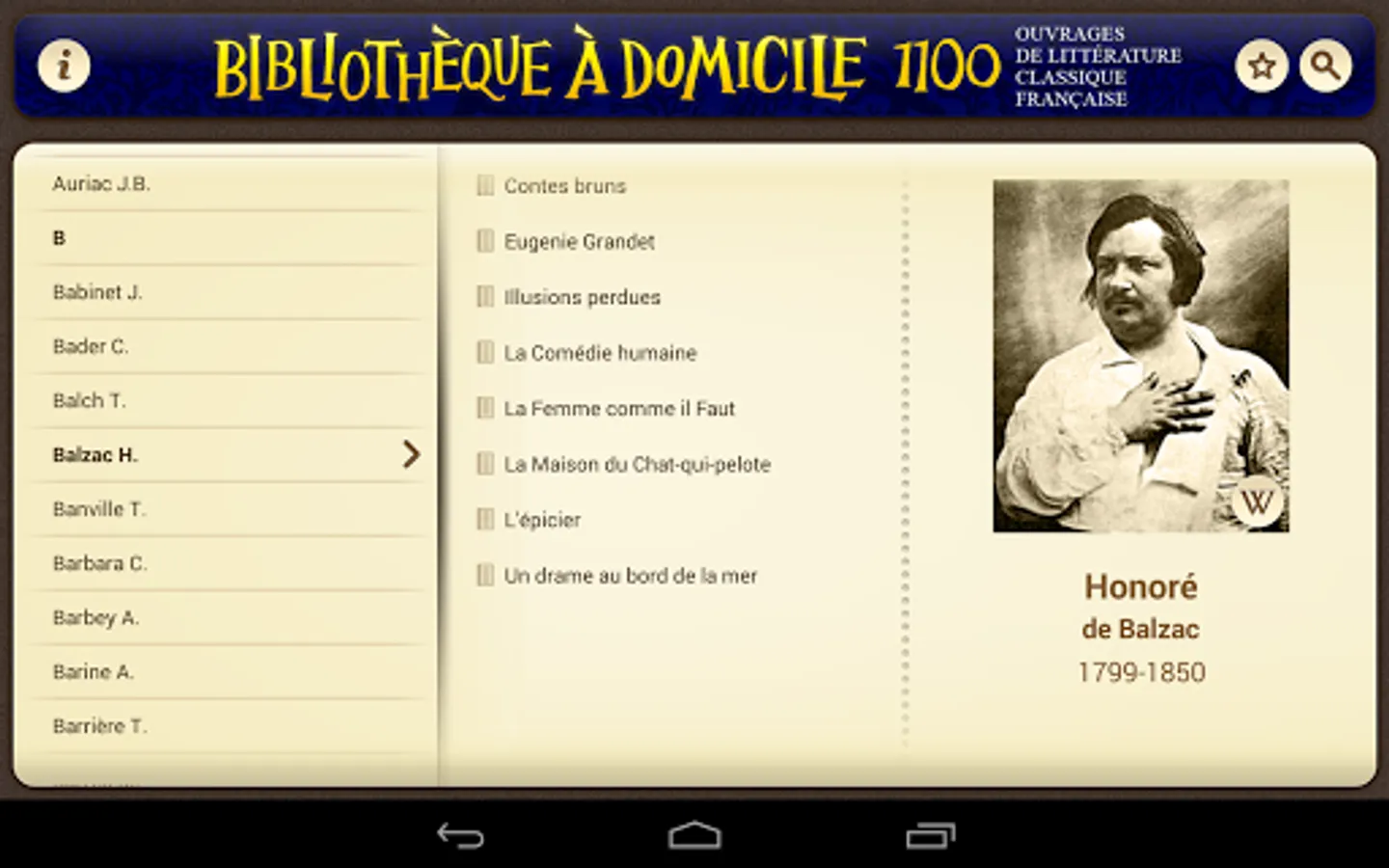 With this app there no more need to search for a book through many databases on the web – just download our application and you will always have a massive e-book collection of the best French-language writers within reach! In the list of authors you will be agreeably surprised to find not only the famous names like Alexandre Dumas, Anatole France, Charles Perrault, Émile Zola, Gustave Flaubert, Guy de Maupassant, Honoré de Balzac, Marcel Proust, Prosper Mérimée, Victor Hugo but many, many others.