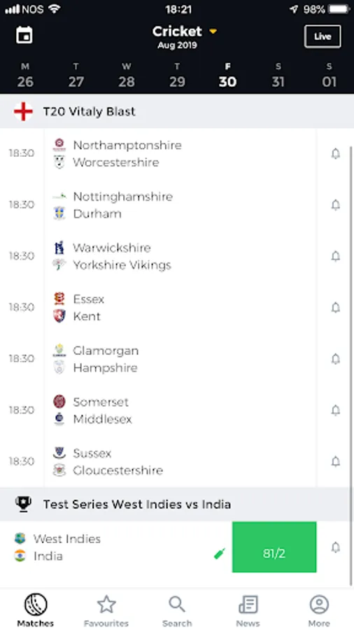 Follow your favorite team's stats, fixtures, standings, live scores and news. Fast and reliable notifications for all game related events from goals to cards, wickets to overs and fixtures to final results. SkyScore has everything you need, all in one place.