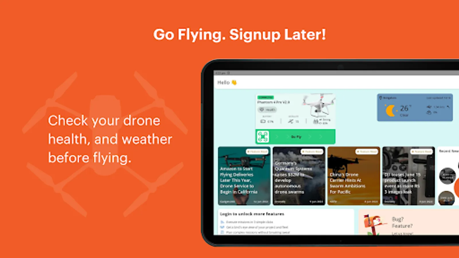 Check critical drone health parameters such as battery, IMU, GPS, Signal Transmission Strength etc before taking off. Fly your DJI drone with confidence!