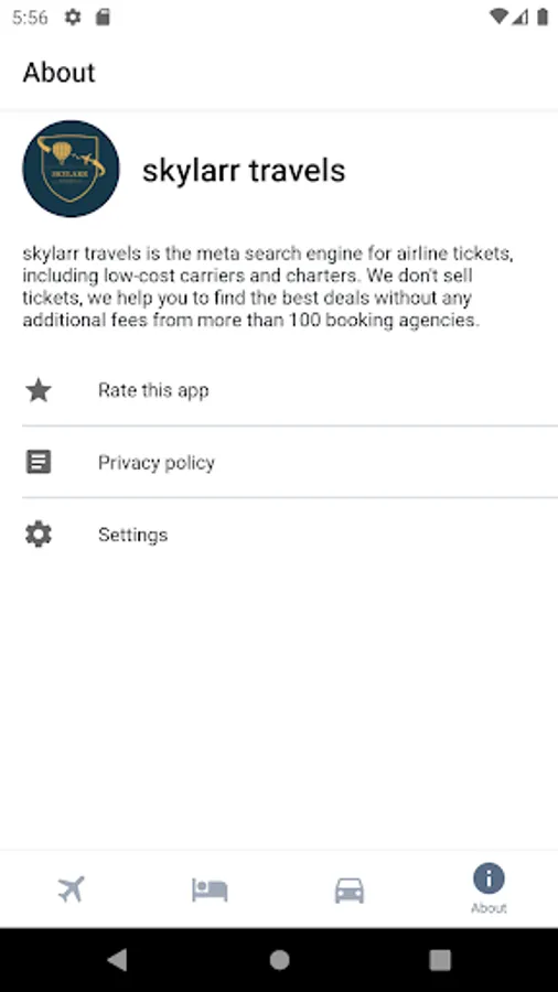 SKYLARR is travel meta search engine that connects customers to over 100 best booking agencies around the world. Our app contains the variety that suits every individual customer per their needs, from cheap flight and hotel to best and luxurious hotels and flights. We do not sell tickets nor do we keep your personal information, all we do is to provide customer satisfaction and comfort by bringing over 100 best booking agencies together. With SKYLARR you don't need to move from one agency to another, we have got you covered, all in one app