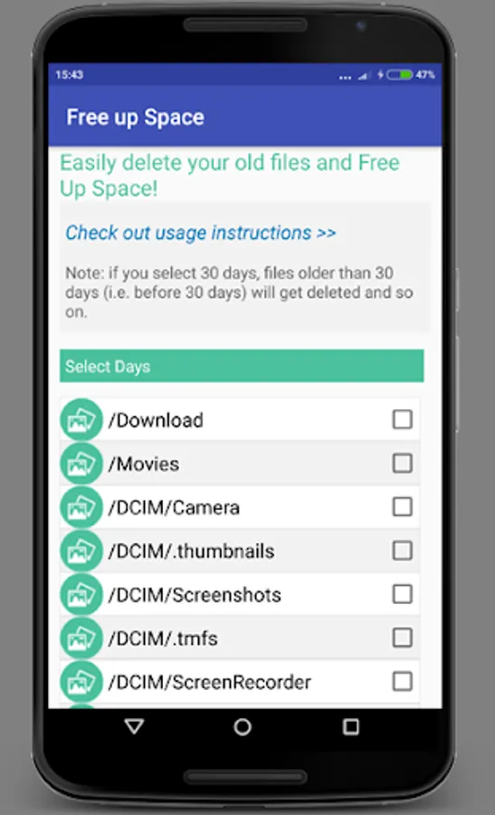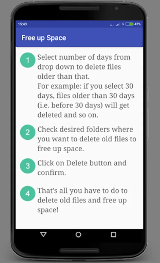Free up Space is an utility app which helps you to increase storage space on phone by deleting old files.
