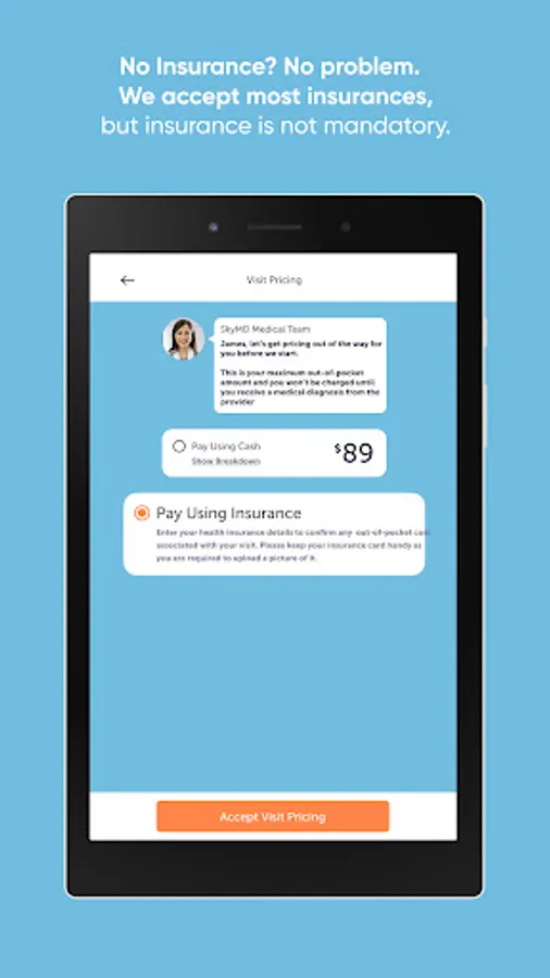 • Get a price estimate for the cost of care; cash or look up your health insurance