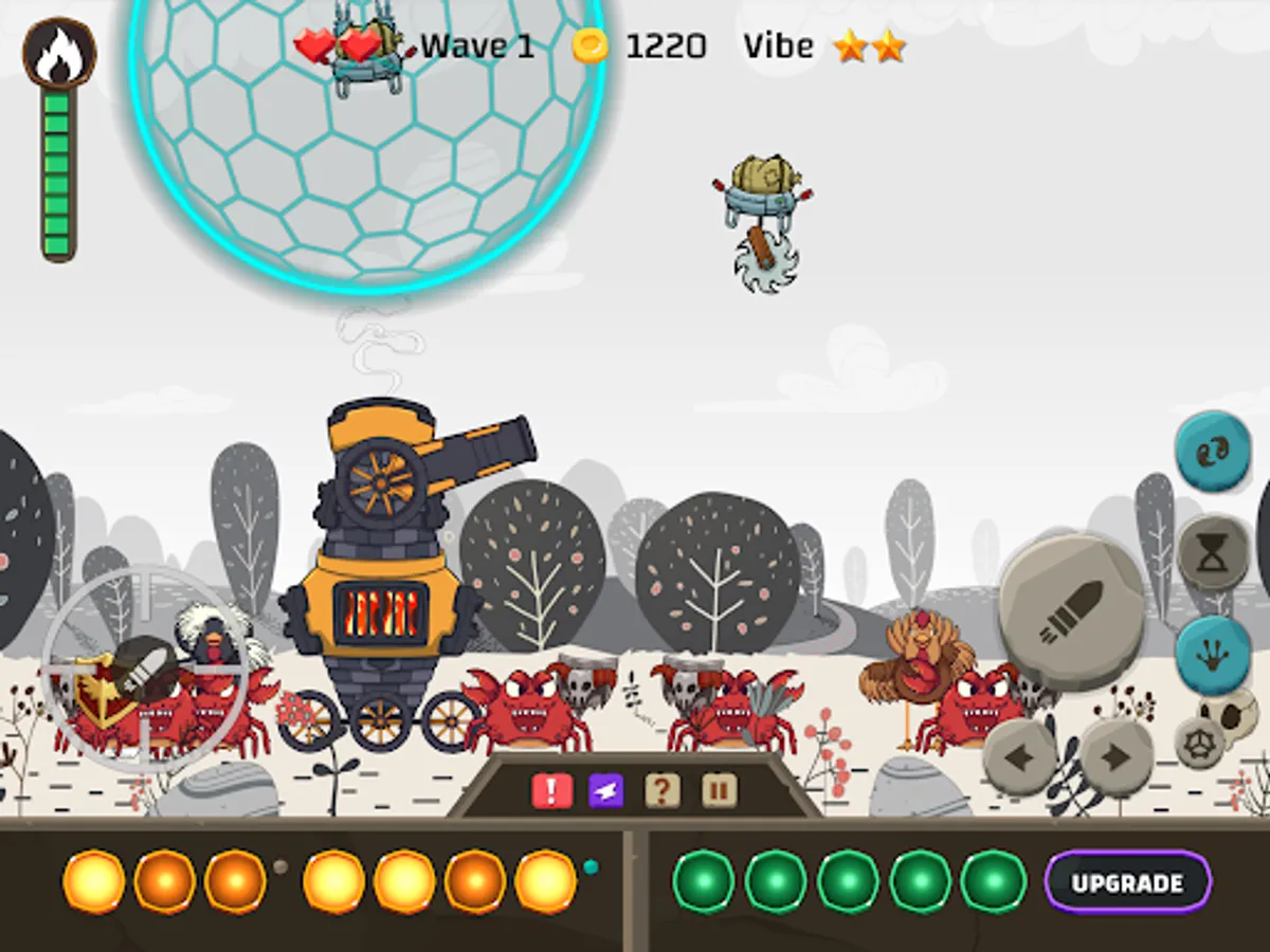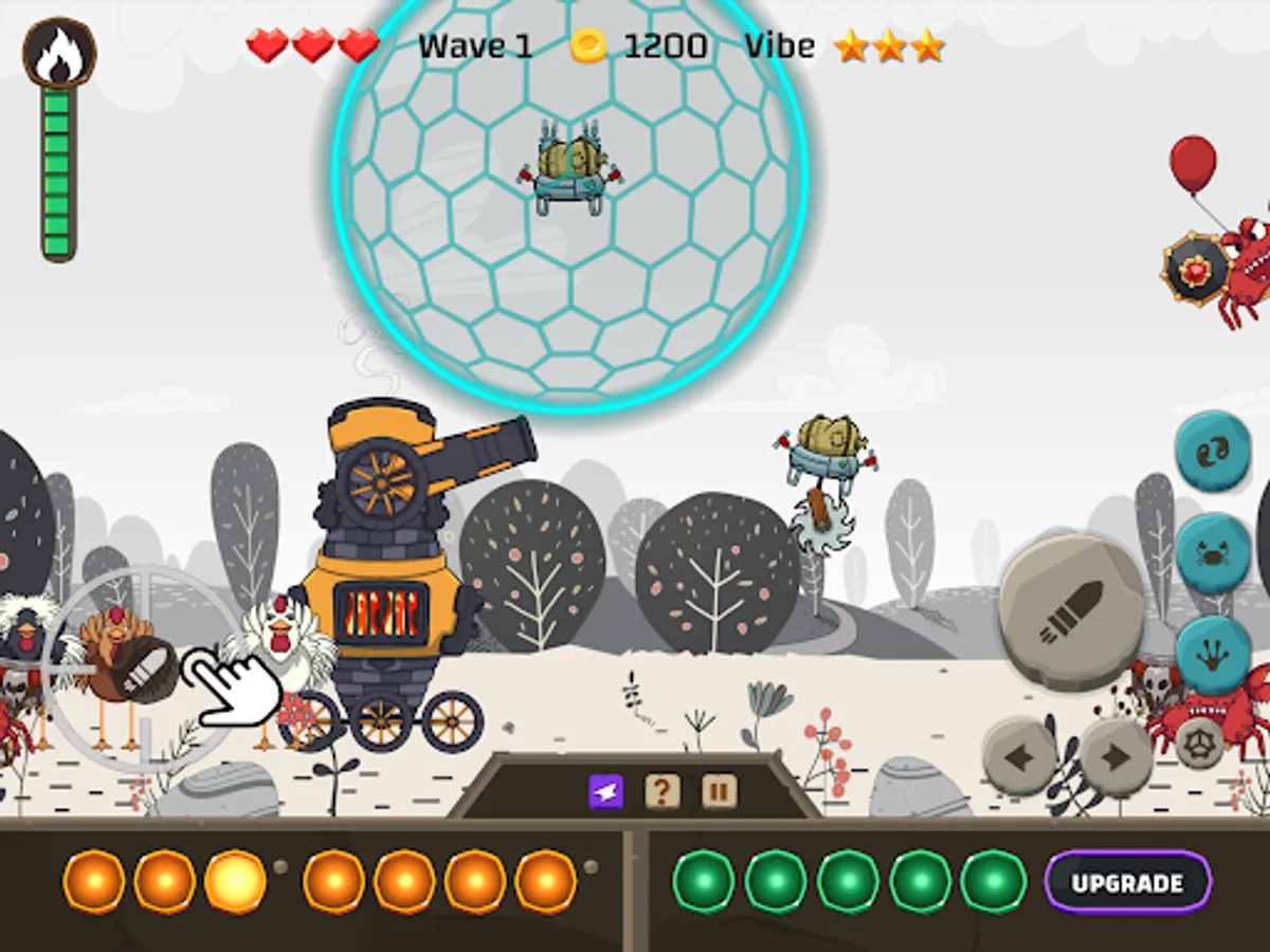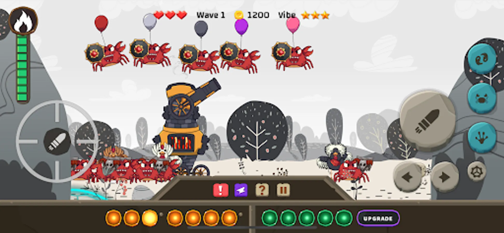 Waves of hungry villain crabs have the only goal to steal your party chickens. Defend your tribe with an archaic cannon and abundance of explosives. Crab Invasion is a fast paced tower defense game with a revolutionary and never-seen-before gameplay. Shoot, place and upgrade towers, but also play music as a DJ to your allied troops. Eliminate all invaders in fifteen handcrafted waves. Unlock more levels and discover new enemies and strategies. Get ready to shoot and blast invading crabs. Become part of this addictive Tower Defense game.