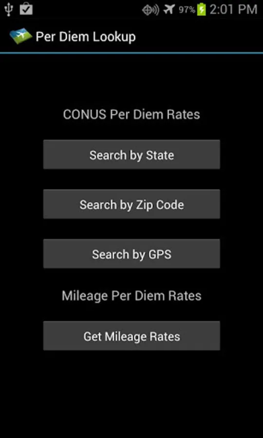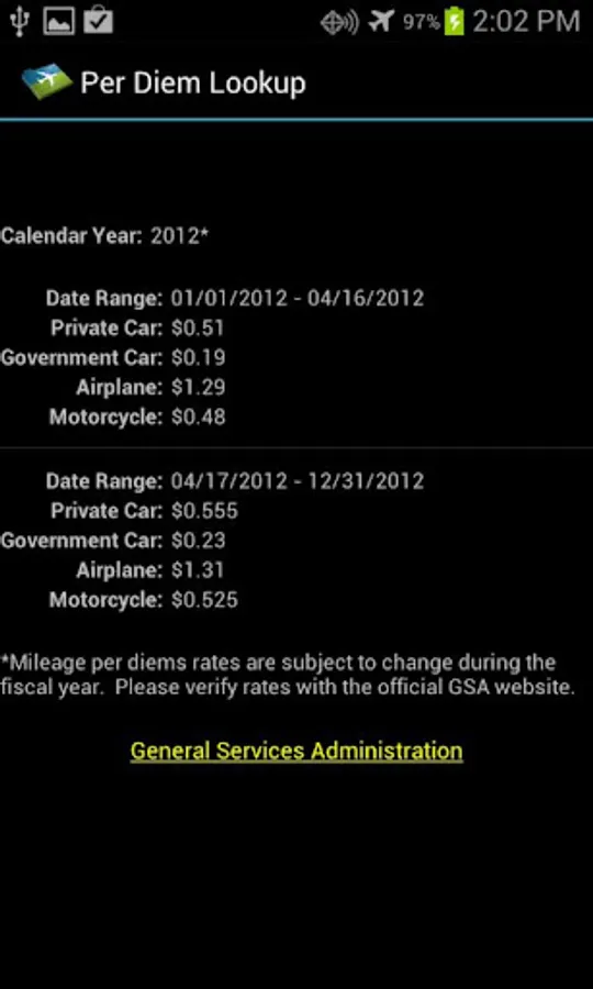 Currently, rates included are for CONUS per diem rates and mileage rates established by GSA. OCONUS rates, including Alaska, Hawaii, Puerto Rico and Guam, are not included in this app. We do provide convenient links to look up these rates.