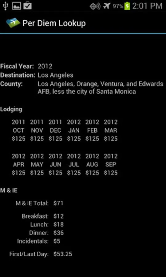 Look up United States lodging and meal per diem rates right on your phone. A per diem is the daily allowance for lodging (excluding taxes), meals and incidental expenses. The rates included in this app are established and published by the General Services Administration (GSA) for destinations in the lower 48 contiguous United States.