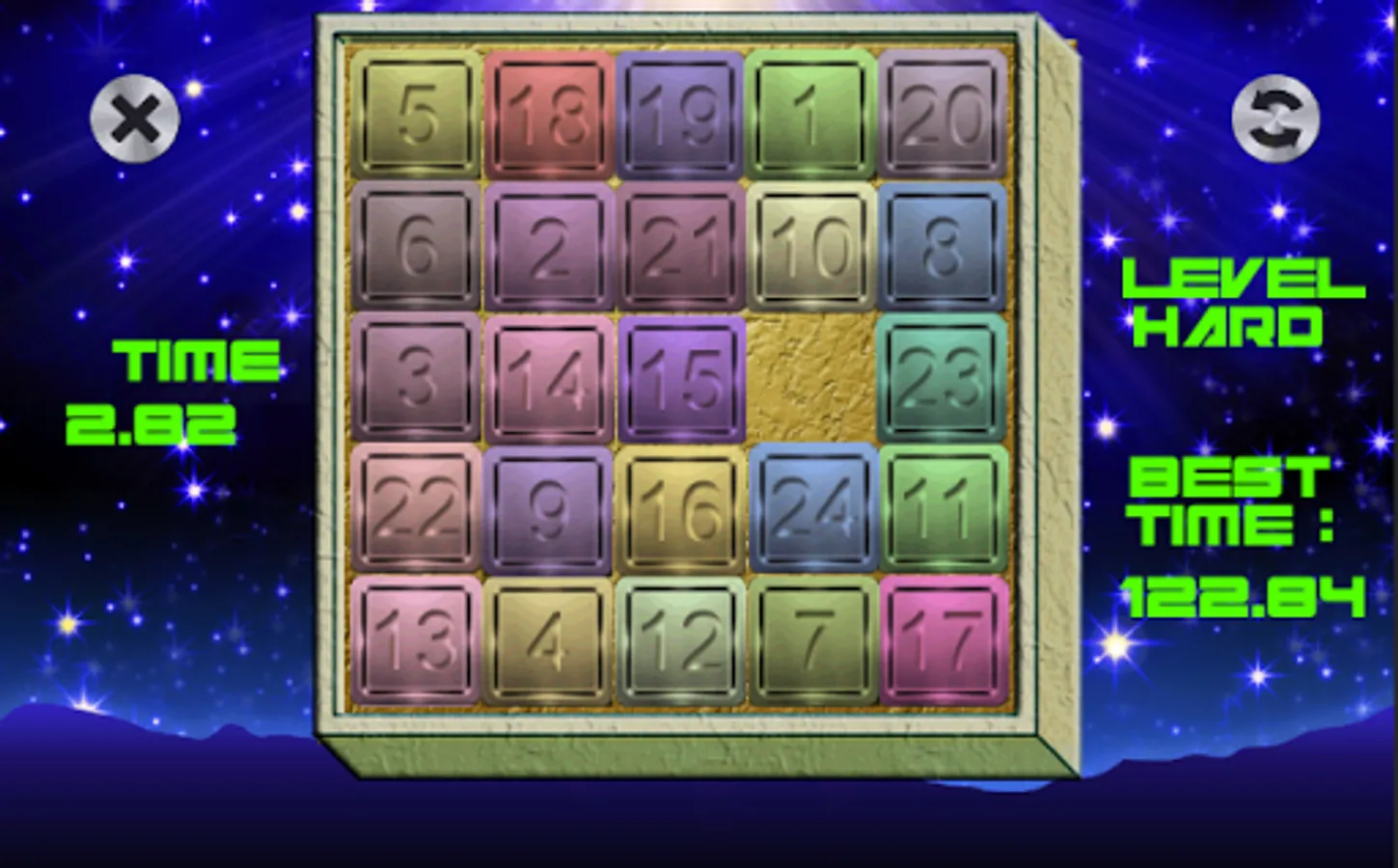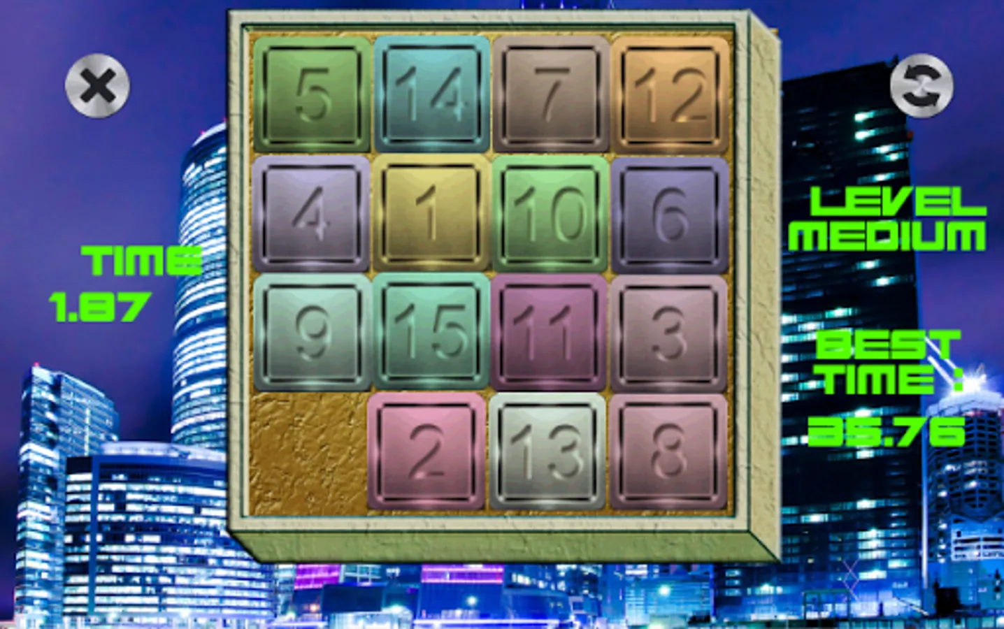 Game on a grid of 4 × 4 squares with 15 pieces numbered from 1 to 15. These tokens can not move on the board by sliding in the only empty cell at a given time. The game is to put the pieces in numerical order.