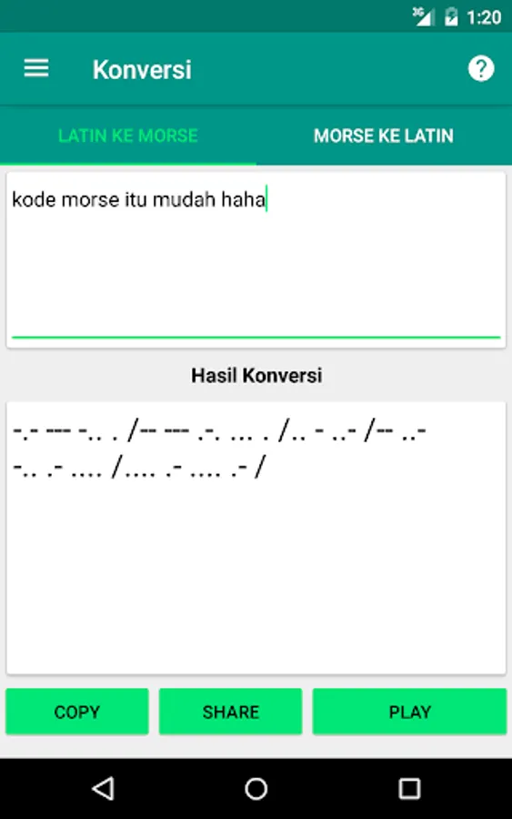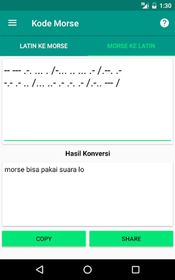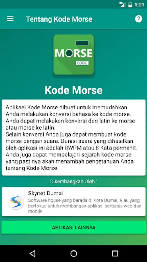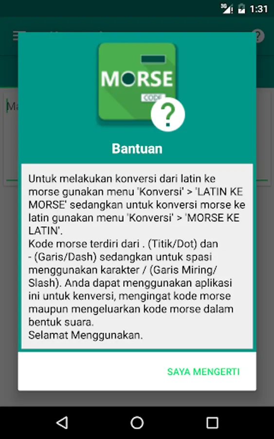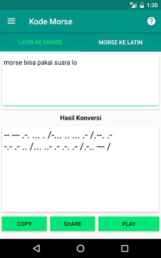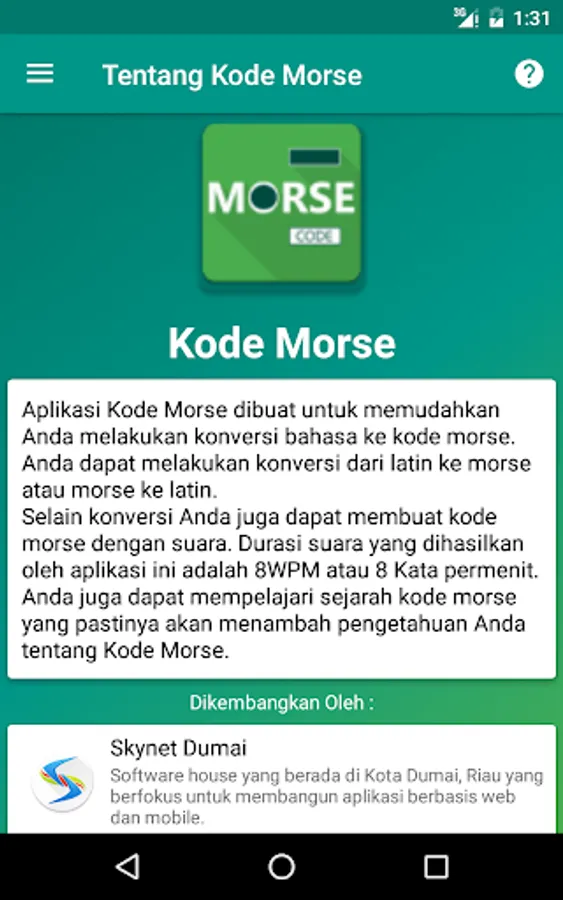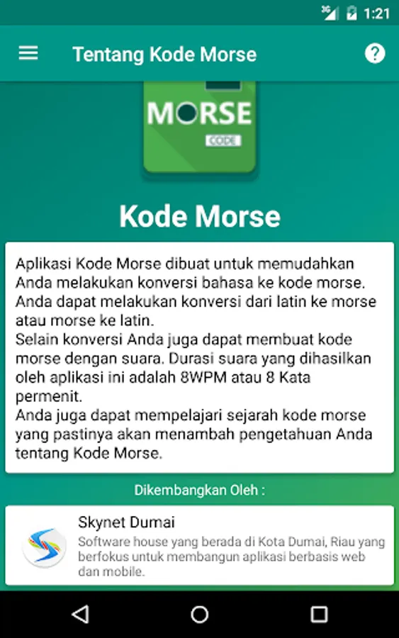 Application Morse Code is designed to enable you to convert language into Morse code. You can do the conversion from latin to morse morse code to latin.Selain conversion or you can make morse code with a voice. The duration of the sound produced by this application is 8WPM or 8 words per minute.