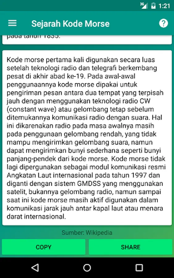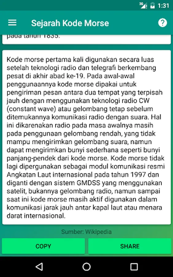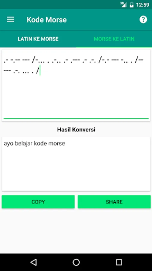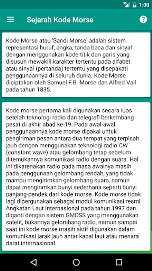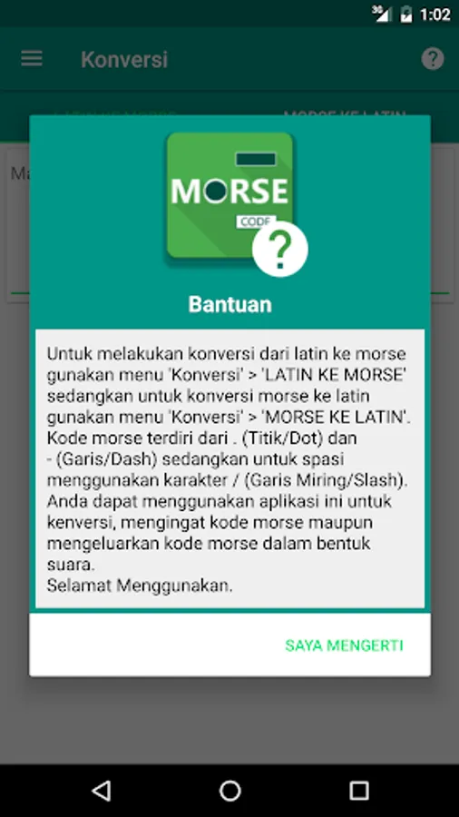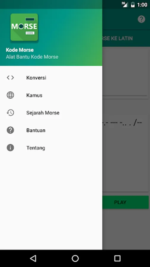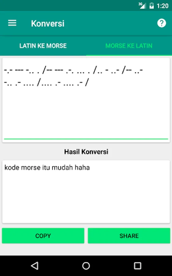 Application Morse Code is designed to enable you to convert language into Morse code. You can do the conversion from latin to morse morse code to latin.Selain conversion or you can make morse code with a voice. The duration of the sound produced by this application is 8WPM or 8 words per minute.