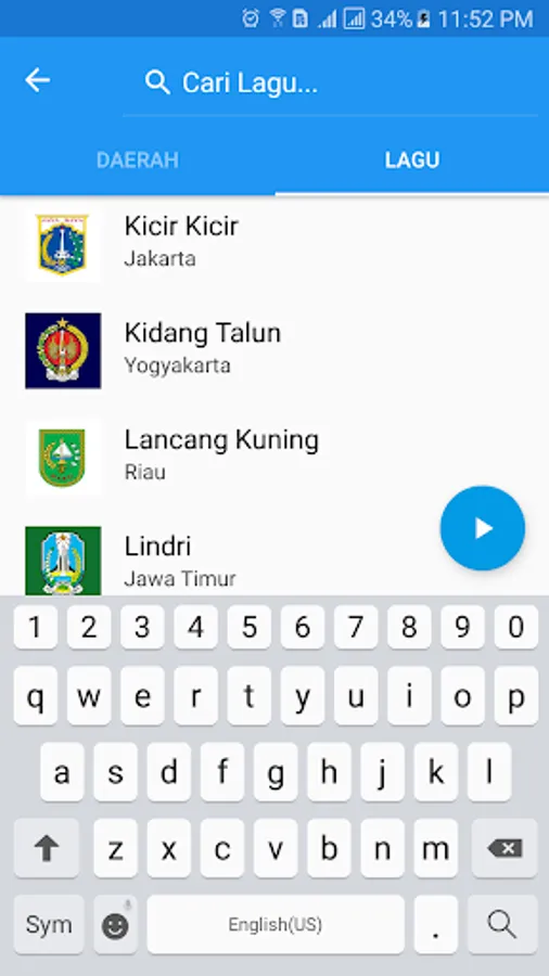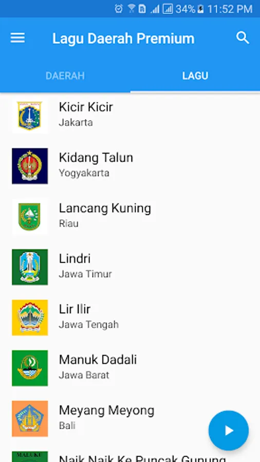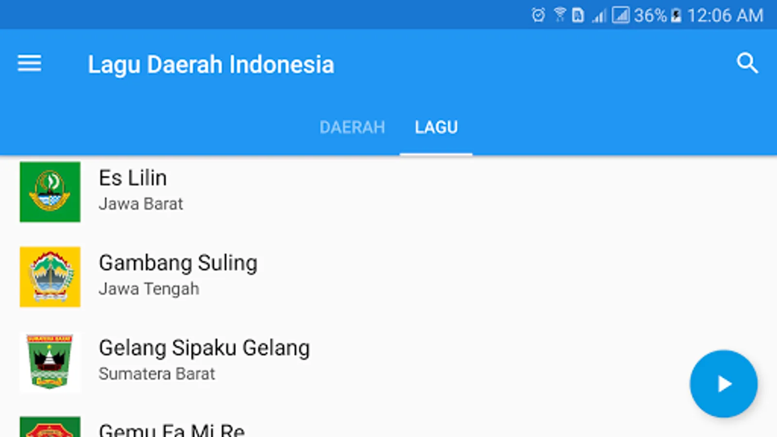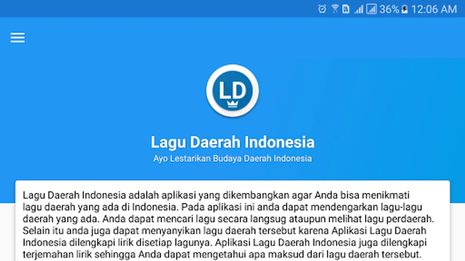 Lagu Daerah Indonesia adalah aplikasi yang dikembangkan agar Anda bisa menikmati lagu daerah yang ada di Indonesia. Pada aplikasi ini anda dapat mendengarkan lagu-lagu daerah yang ada. Anda dapat mencari lagu secara langsug ataupun melihat lagu perdaerah. Selain itu anda juga dapat menyanyikan lagu daerah tersebut karena Aplikasi Lagu Daerah Indonesia dilengkapi lirik disetiap lagunya. Aplikasi Lagu Daerah Indonesia juga dilengkapi terjemahan lirik sehingga Anda dapat mengetahui apa maksud dari lagu daerah tersebut.