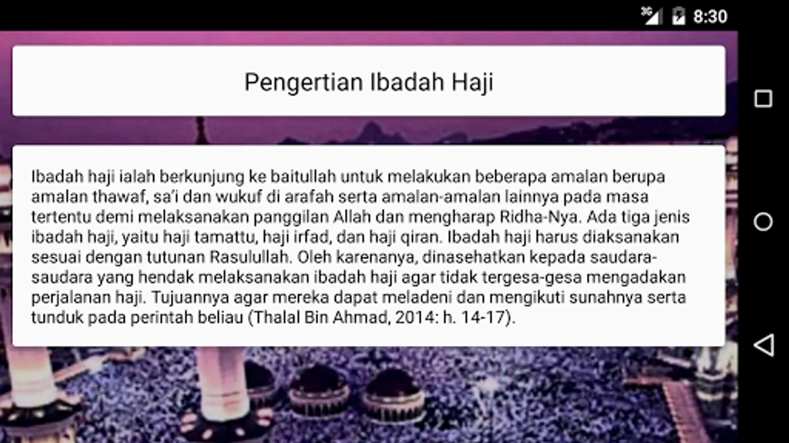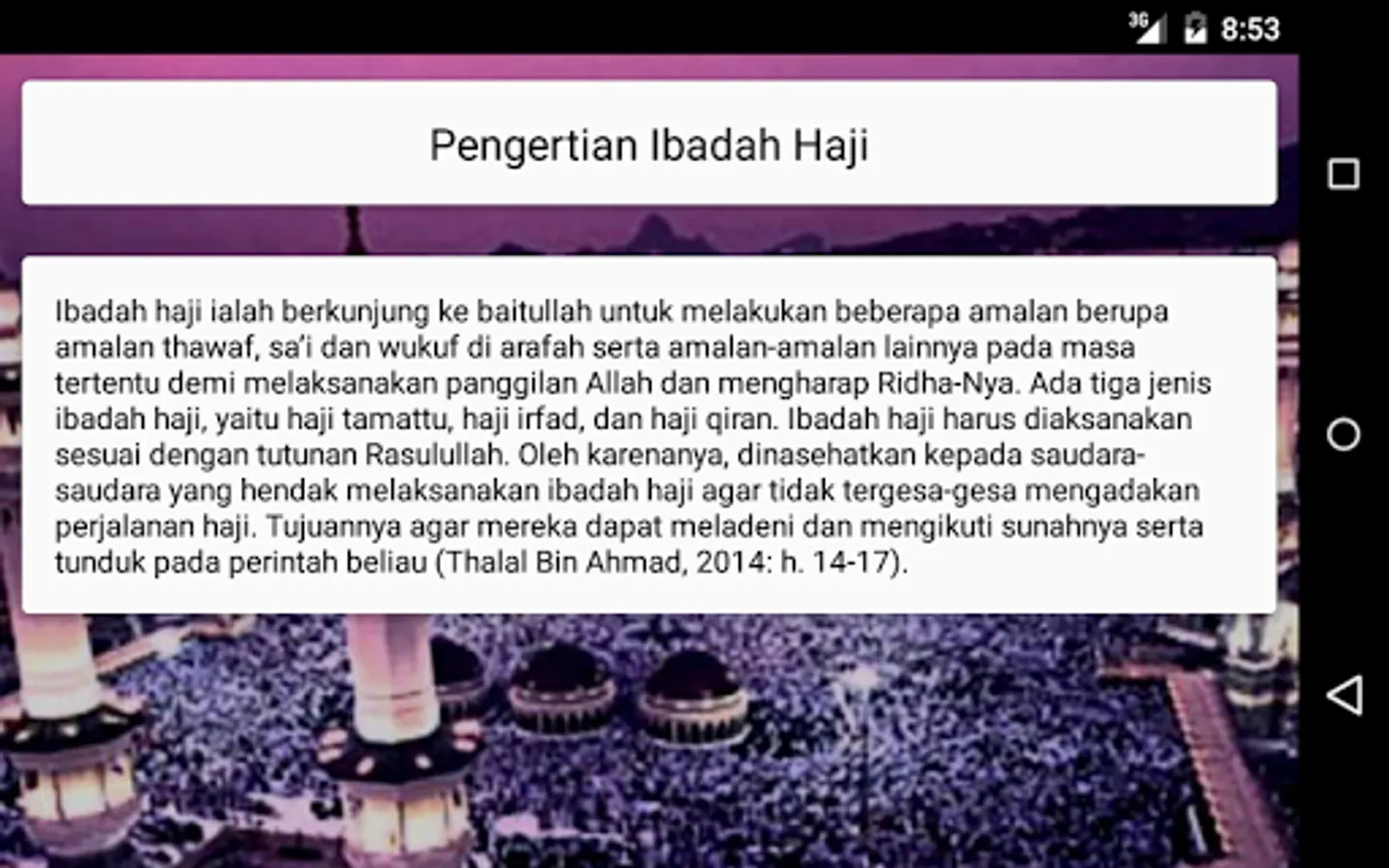 Panduan Ibadah Haji merupakan panduan lengkap ibadah haji dari awal hingga selesai melakukan ibadah haji. Aplikasi ini juga dilengkapi do'a-do'a yang dapat di baca ketika melakukan ibadah haji.